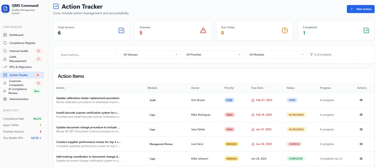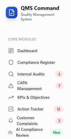QMS Command features 7 Core Modules for Compliance Tracking, Internal Audits, CAPA Management, KPI's & Objective Tracking, Action Tracker, Customer Complaints and an AI Agent who acts as your Compliance Review Specialist.