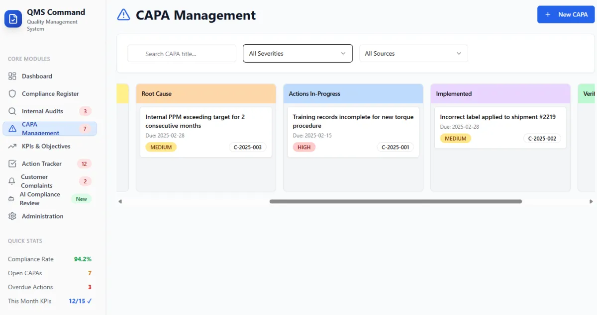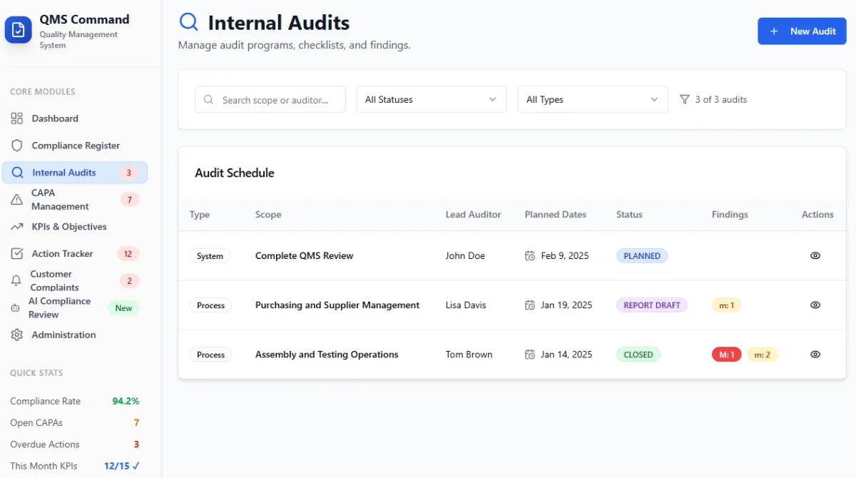 Struggling to stay audit-ready? QMS Command puts compliance, audits, CAPA, and KPIs all in one powerful dashboard. See how you can save hours of prep time, eliminate scattered spreadsheets, and build customer trust with enterprise-level quality management tools—without enterprise-level cost.