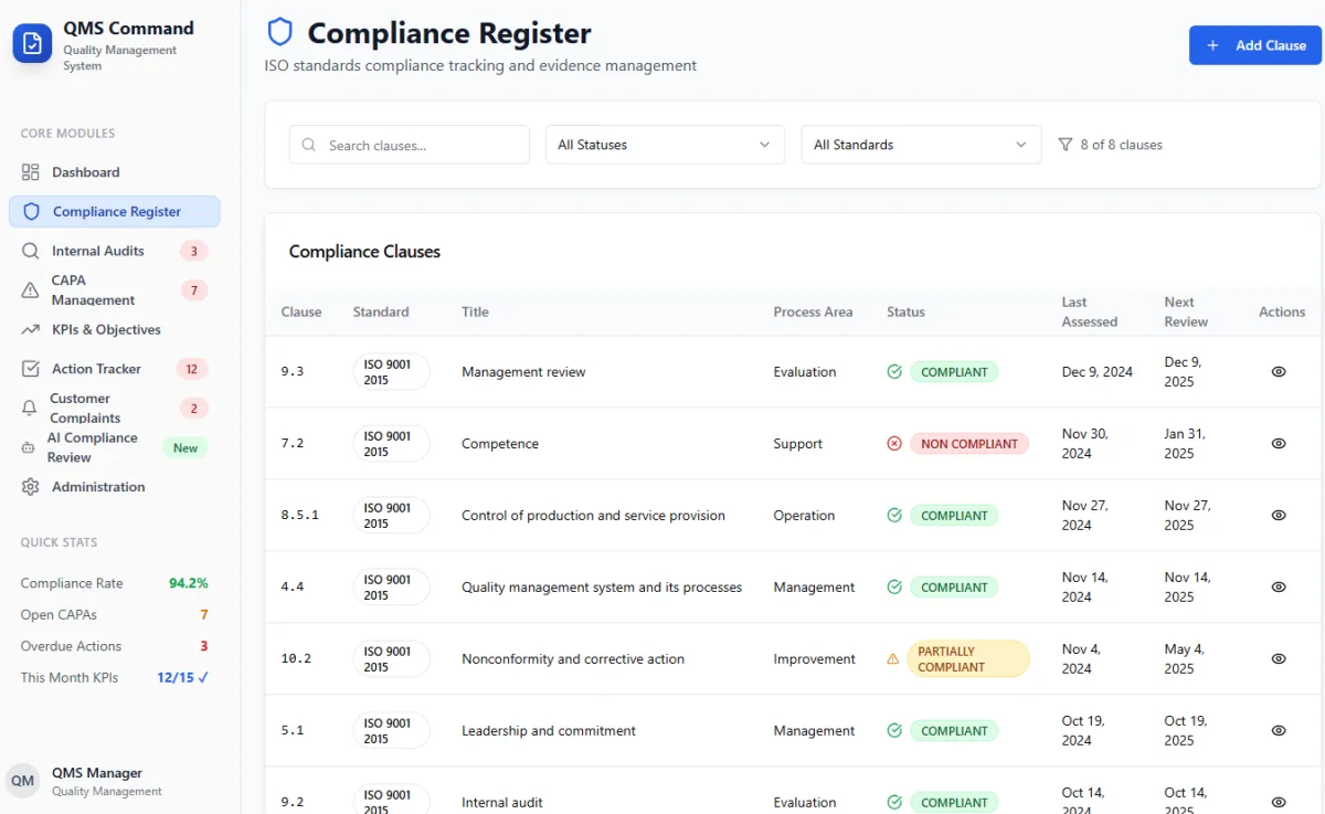 QMS Command’s AI Compliance Review scans your documents and processes against ISO 9001 and customer standards, flagging gaps before they become findings.
