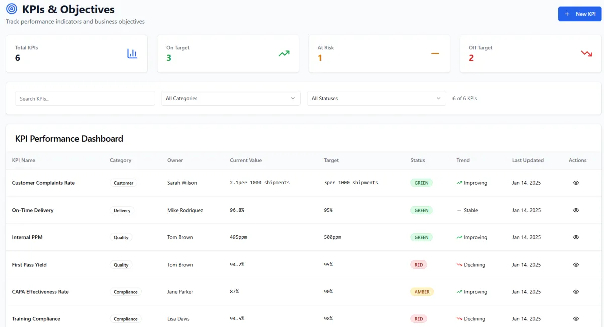 Assign, track, and complete quality-related tasks with full accountability. The Action Tracker ensures nothing is forgotten—whether it’s a follow-up from an audit, a corrective action step, or a management review item.
